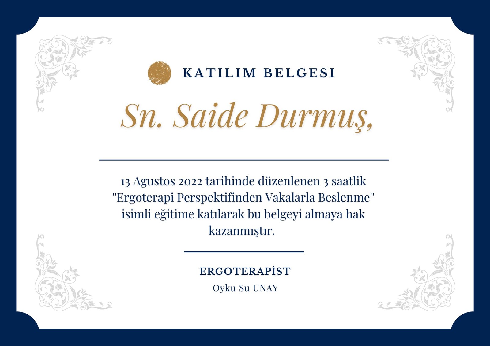 İlk lisans eğitimimi Eskişehir Anadolu Üniversitesi İşletme Fakültesi, ikinci lisans eğitimimi İstanbul Biruni Üniversitesi Sağlık Bilimleri Fakültesi Ergoterapi bölümünde tamamladım. Uzmanlık eğitimim için Üsküdar Üniversitesi Nörobilim A.B.D’ da yüksek lisansımı sürdürmekteyim.